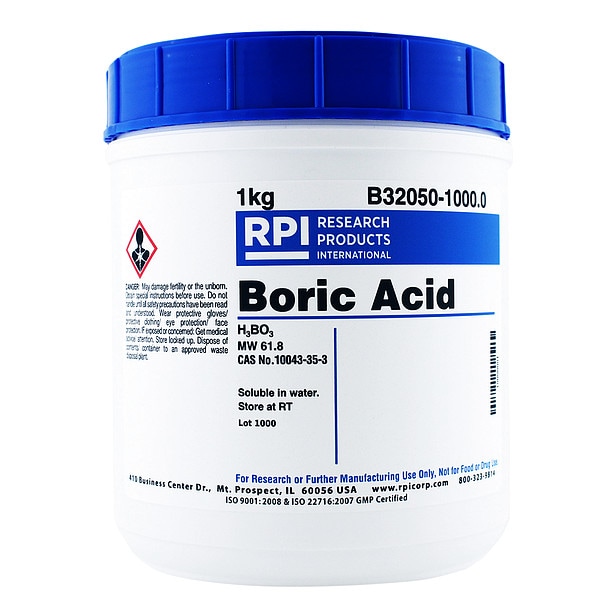 Boric Acid, CAS Number 10043-35-3, Molecular Weight 61.83, Chemical Formula H3BO3, Chemical Grade Lab, Chemical Family Type Acid, Shelf Life 18 mo, Special Information BSE/TSE Free