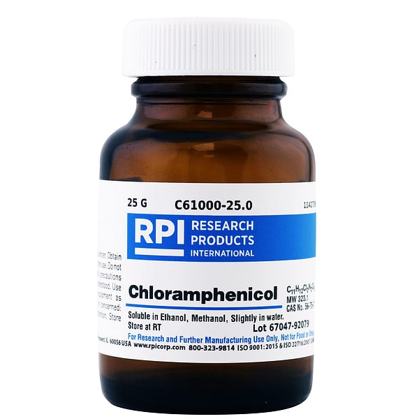 Chloramphenicol, Concentration Not Applicable, CAS Number 56-75-7, Molecular Weight 323.1, Chemical Formula C12H12CI2N2O5, Chemical Grade USP, Shelf Life 18 mo, Special Information pH: 4.5 to 7.5