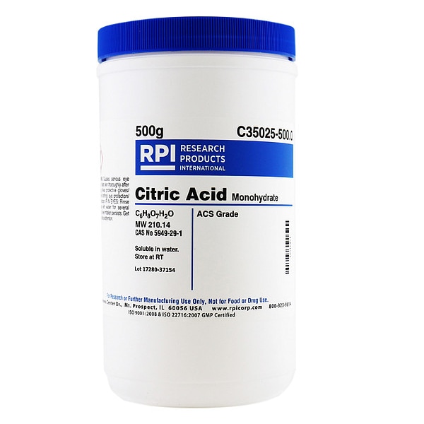 Citric Acid - Monohydrate, CAS Number 5949-29-1, Molecular Weight 210.14, Chemical Formula C6H8O7H2O, Chemical Grade ACS, Chemical Container Size 500 g, Chemical Family Type Acid, Shelf Life 18 mo, Special Information BSE/TSE Free