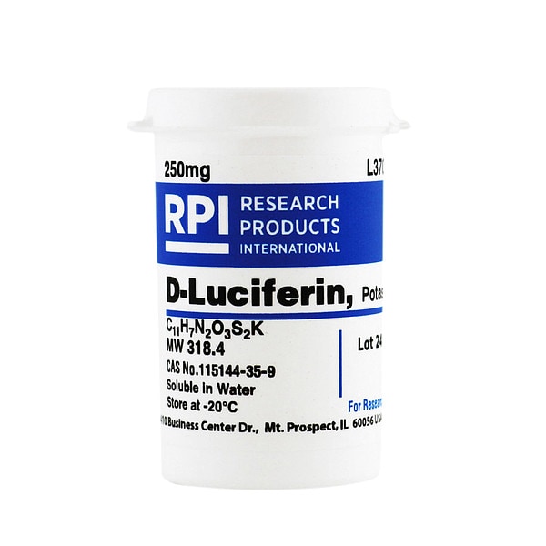 D-Luciferin/Potassium Salt, CAS Number 115144-25-9, Purity Greater Than 95 Percent, Container Size 250 mg, Form Powder, Molecular Weight 318.41, Solubility Water, Storage Temp. -20 Degrees C, Chemical Formula C11H7N2O3S2K, Shelf Life 18 mo