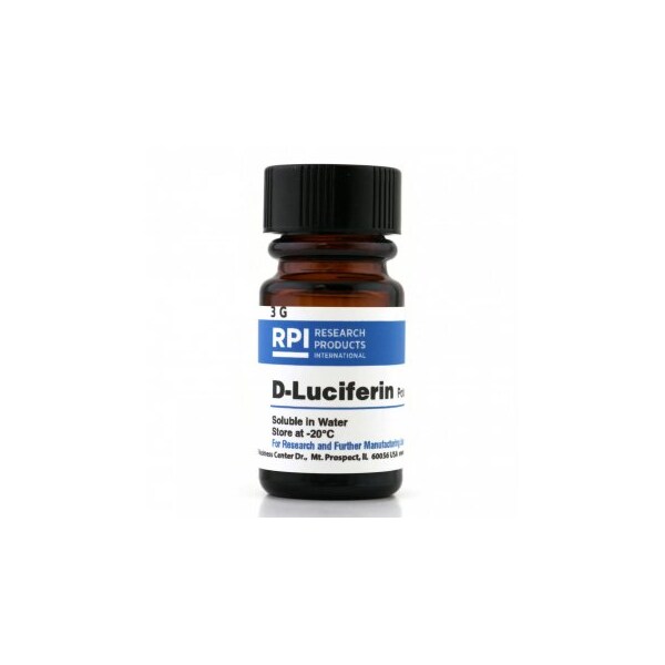 RPI offers the highest purity D-Luciferin Potassium Salt for a wide range of bioluminescent applications. Produces bioluminescence when oxidized by firefly luciferase. Allows highly sensitive bioluminescent measurements. Common research uses reporter gene assays, ATP assays, whole animal studies, DNA sequencing and others. Our product is specially purified and tested extensively to ensure the highest signal and reproducibility with low background and sensitivity. Purity is determined by both standard HPLC and Chiral HPLC methods. Protect from light and moisture.