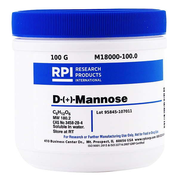 D-(+)-Mannose, CAS Number 3458-28-4, Molecular Weight 180.2, Chemical Formula C6H12O6, Chemical Grade Lab, Chemical Family Type Reagent, Shelf Life 18 mo, Special Information BSE/TSE Free