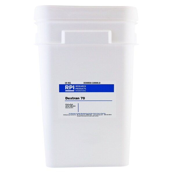 CAS Number: 9004-54-0Molecular Weight: 70,000Chemical Formula: C6H10O5nSolubility: waterStorage Temperature: 2-8CStorage Conditions: RefrigeratorManufacturer: Dextran Products Appearance: White to slightly off white powder Loss on Drying: 7.0 %Ash Content: 2.0 %Specific Rotationa 20D 2% solution: +195 - +203 oIntrinsic Viscosity @ 37 oC 1% Solution: 0.22 - 0.27 pH 6% Solution: 4.5 - 7.0 Color of solution @ 375nm 6% solution: 0.15 ODCold water solubility 1% solution: Soluble in cold water Non Animal Origin: Conforms BSE/TSE Free: BSE/TSE Free Country of Origin: Canada Shipping Weight: 25 lbsShipping Dimensions: 10.00 x 11.25 x 10.00Research or further manufacturing use only, not for food or drug use.