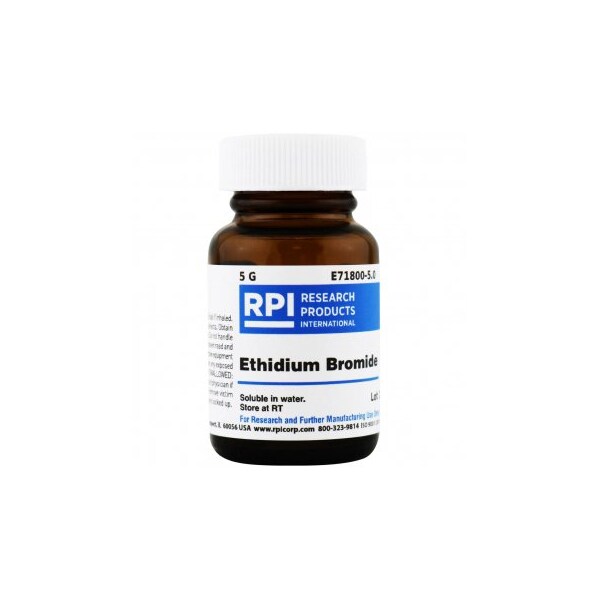 Ethidium Bromide is commonly used as a nucleic acid stain for gel electrophoresis due to its fluorescence when exposed to UV light. Ethidium Bromide intercalates double-stranded DNA and RNA and also acts as inhibitor of RNA and DNA polymerase. Can be used to stain gel after electrophoresis or incorporated into the gel and running buffer.