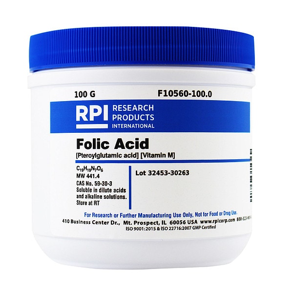 Folic Acid (Pteroylglutamic Acid), Container Size 100 g, Solubility Diluted Acids and Alkaline Solutions, Form Powder, Container Material Plastic, Storage Temp. Room Temperature, Shelf Life 18 mo