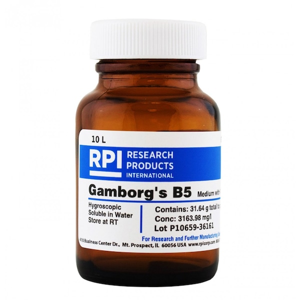 Hygroscopic. Basal salt mixture containing micro and macro elements with vitamins as described by Gamborg, et. al. 1968. Package contains 3.16 grams of powder per liter of medium.Solubility: WaterStorage Temperature: Room TemperatureStorage Conditions: Room TemperatureAppearance: Powder Potassium Nitrate: 2500.00 mg/lAmmonium Sulfate: 134.00 mg/lSodioum Dihydrogen Phosphate: 130.44 mg/lMagnesium Sulfate Anhydrous: 121.56 mg/lGamborg B5 Micro Elements: 52.75 mg/lCalcium Chloride Anhydrous: 113.23 mg/lGamborg B5 Vitamin Mixture: 112.00 mg/lStorage Condition: In a well closed container at room temperature. Protected from moisture. Country of Origin: Report Shipping Weight: 0.2401 lbsShipping Dimensions: 1.63 x 3.00 x 1.63Research or further manufacturing use only, not for food or drug use.