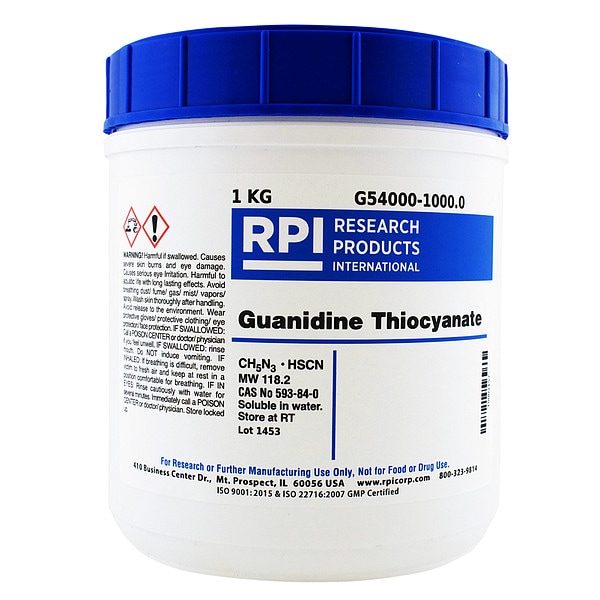 Guanidine Thiocyanate, Container Size 1 kg, Solubility Water, Form Powder, Container Material Plastic, Storage Temp. Room Temperature, Shelf Life 18 mo