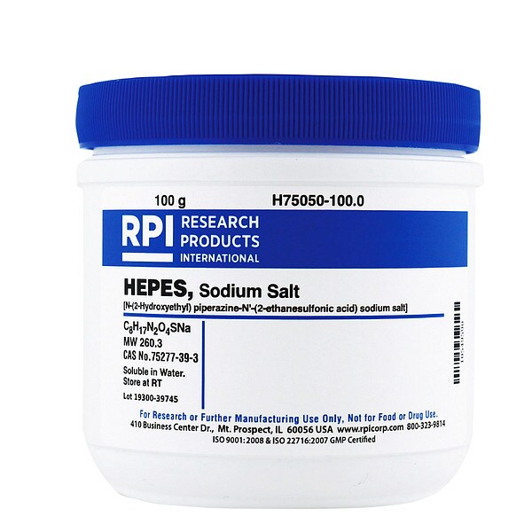 HEPES Sodium Salt, Concentration H75050, CAS Number 75277-39-3, Molecular Weight 260.3, Chemical Formula C8H17N2O4SNa, Chemical Container Size 100 g, Shelf Life 18 mo