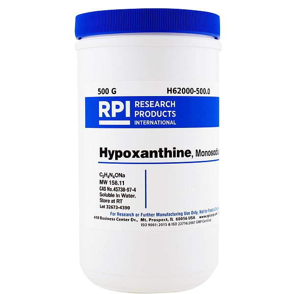 Hypoxanthine, monosodium salt, Container Size 500 g, Solubility Water, Form Powder, Container Material Plastic, Storage Temp. Room Temperature, Shelf Life 18 mo
