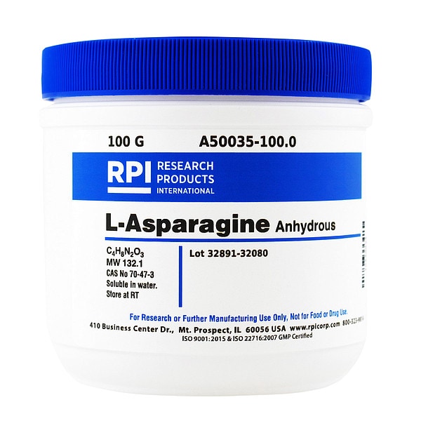 L-Asparagine, Anhydrous, CAS Number 70-47-3, Molecular Weight 132.1, Chemical Formula C4H8N2O3, Chemical Container Size 100 g, Chemical Family Type Acids, Shelf Life 18 mo
