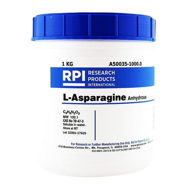 L-Asparagine, Anhydrous, CAS Number 70-47-3, Molecular Weight 132.1, Chemical Formula C4H8N2O3, Chemical Container Size 1 kg, Chemical Family Type Acids, Shelf Life 18 mo