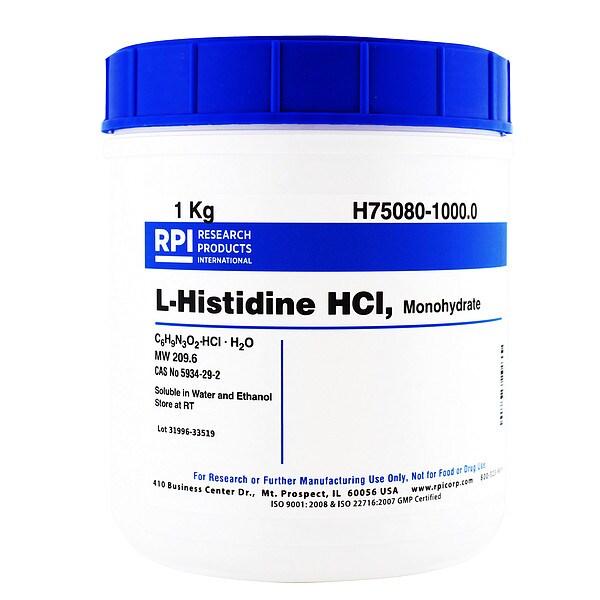 L-Histidine HCL Monohydrate, CAS Number 5934-29-2, Molecular Weight 209.63, Chemical Formula C6H9N3O2 HCl H2O, Chemical Container Size 1 kg, Shelf Life 18 mo