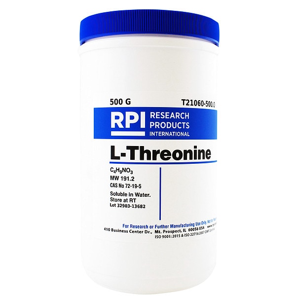 L-Threonine, CAS Number 72-19-5, Molecular Weight 119.1, Chemical Formula C4H9NO3, Chemical Container Size 500 g, Chemical Family Type Acids, Shelf Life 18 mo