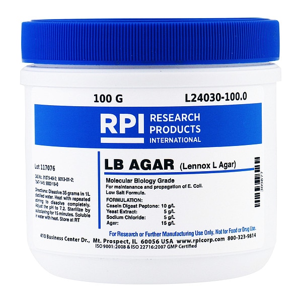 Agar - LB - Low Salt Formula, CAS Number 7647-14-5, 8013-01-2, 9002-18-0, 91079-40-2, Chemical Formula C14H24O9, Chemical Grade Lab, Chemical Family Type Reagent, Shelf Life 18 mo, Special Information pH: 6.8 - 7.2