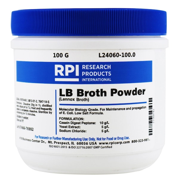 For propagation and maintenance of E. Coli. Low Salt Formula. Molecular Biology Grade.Dissolve 20 grams in 1 liter distilled water. Then adjust pH to 7.2. Heat and frequently agitate to completely dissolve. Sterilize by autoclaving for 15 minutes.Ingredients:Casein Digest of Peptone: 10 g/LYeast Extract: 5 g/LSodium Chloride: 5 g/LCommon Name: Lennox BrothCAS Number: 91079-40-2;8013-01-2;7647-14-5Solubility: WaterStorage Temperature: Room TemperatureStorage Conditions: Room TemperatureDCM Appearance: Homogeneous free flowing, light beige PPM Appearance: Clear, No to light ppt, light yellow pH 2% water @25C: 6.8 - 7.2 Microorganism E. coli ATCC 23724: Good to Excellent Microorganism E. coli ATCC 33694: Good to Excellent Microorganism E. coli ATCC 33849: Fair to Excellent Microorganism E. coli ATCC 39403: Good to Excellent Microorganism E. coli ATCC 47014: Good to Excellent Sodium Chloride: 5 g/lYeast Extract: 5 g/LCasein Peptone: 10 g/LShipping Weight: 0.3201 lbsShipping Dimensions: 3.50 x 3.75 x 3.50Research or further manufacturing use only, not for food or drug use.