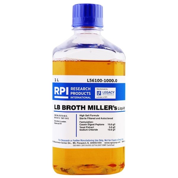 Sterile Filtered and AutoclavedLB Broth Miller's Liquid is a fundamental growth medium essential for bacterial cultivation. Specifically formulated, it provides an optimal nutrient blend to support robust bacterial growth. Widely preferred for its reliability and versatility, LB Broth Miller's Liquid is compatible with a diverse array of bacterial strains, making it indispensable for microbiology, molecular biology, and biotechnology applications. Its balanced formulation fosters rapid bacterial proliferation, facilitating genetic manipulation, protein expression studies, and other research endeavors. Researchers rely on LB Broth Miller's Liquid as a foundational tool to explore microbial physiology, genetics, and the mechanisms underlying various biological processes.Tryptone: 10.0 g/lYeast Extract: 5.0 g/lSodium Chloride: 10.0 g/lCommon Name: Luria-Bertani BrothCAS Number: 91079-40-2, 8013-01-2, 7647-14-5Storage Temperature: Room TemperatureStorage Conditions: Room TemperatureAppearance: Yellow - Amber Clear Liquid Identification: Pass Test Osmolality: 389 - 431 mOsm/KgpH @25 C: 7.0 - 7.4 Sterility: Pass Test Shipping Weight: 2.2 lbsShipping Dimensions: 3.75 x 8.75 x 3.75Research or further manufacturing use only, not for food or drug use.