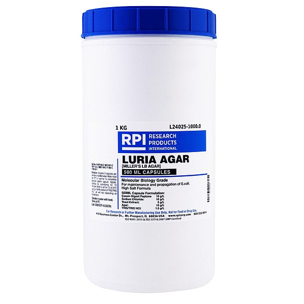 Agar - Luria - Miller's LB Agar, CAS Number 7647-14-5, 77-86-1/1185-53-1, 8013-01-2, 9002-18-0, 91079-40-2, Chemical Formula C14H24O9, Chemical Grade Lab, Chemical Family Type Buffer, Shelf Life 18 mo, Special Information Capsules contain all necessary ingredients for maintenance and propagation of E. coli., Package Quantity 50