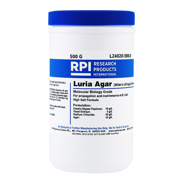Luria Agar (Millers LB), Purity Greater Than 95 Percent, Container Size 500 g, Form Powder, Solubility Water, Storage Temp. Room Temperature, Shelf Life 18 mo