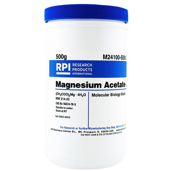 Magnesium Acetate Tetrahydrate, CAS Number 16674-78-5, Purity Greater Than 95 Percent, Container Size 500 g, Form Powder, Molecular Weight 214.45, Solubility Water, Storage Temp. Room Temperature, Chemical Formula C4H6MgO4, 4H2O, Shelf Life 18 mo