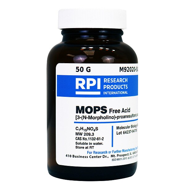 MOPS, Free Acid, Container Size 50 g, Solubility Water, Form Powder, Container Material Glass, Storage Temp. Room Temperature, Shelf Life 18 mo