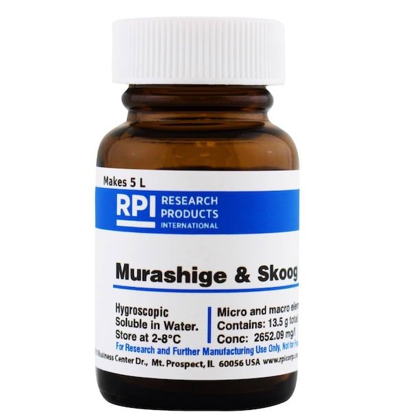 Basal salt mixture containing micro and macro elements with vitamins as described by Murashige and Skoog 1962. Modified by eliminating ammonium nitrate. Concentrate: 2652.09 mg/L HygroscopicSolubility: WaterStorage Temperature: 2-8CStorage Conditions: RefrigeratorCobalt Chloride Hexahydrate: 0.025 mg / LCupric Sulfate Pentahydrate: 0.025 mg/lEDTA- Ferric Sodium Salt: 36.70 mg/lBoric Acid: 6.20 mg/lPotassium Iodide: 0.83 mg / LManganese Sulfate Monohydrate: 16.90 mg / LSodium Molybdate Dihydrate: 0.25 mg/lZinc Sulfate Heptahydrate: 8.60 mg/lCalcium Chloride Anhydrous: 332.02 mg/lPotassium Nitrate: 950.00 mg/lPotassium Dihydrogen Phosphate: 170.00 mg/lMagnesium Sulfate Anhydrous: 180.54 mg/lBSE/TSE Free: BSE/TSE Free Country of Origin: Report Shipping Weight: 0.1199 lbsShipping Dimensions: 3.38 x 4.63 x 3.38Research or further manufacturing use only, not for food or drug use.
