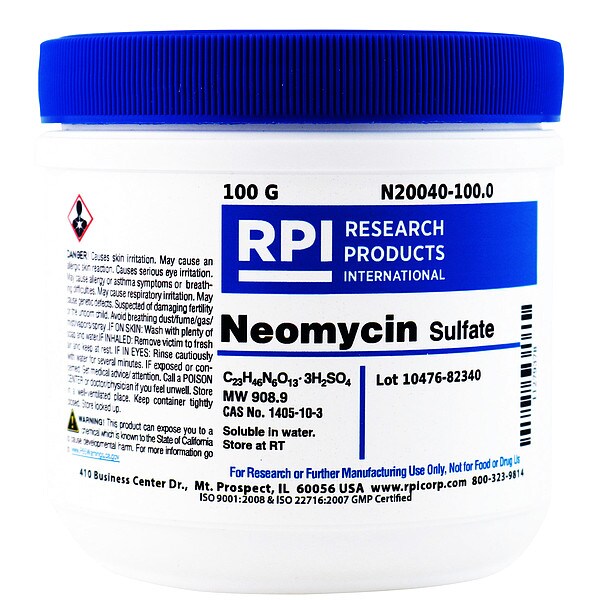 Neomycin Sulfate, CAS Number 1405-10-3, Molecular Weight 908.9, Chemical Formula C23H46N6O13;3H2SO4, Chemical Grade Lab, Shelf Life 18 mo, Special Information pH (3.3 Percent in Aqueous Solution): 5.0 to 7.5