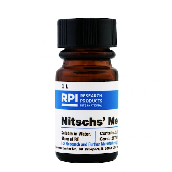 Basal salt mixture containing micro and macro elements as described by Nitsch & Nitsch. 1969.Solubility: WaterStorage Temperature: Room TemperatureStorage Conditions: Room TemperatureAppearance: White Solid Potassium Nitrate: 950.00 mg/lAmmonium Nitrate: 720.00 mg/lPotassium Dihydrogen Phosphate: 68.00 mg/lMagnesium Sulfate Anhydrous: 90.27 mg/lNitsch Micro Elements: 75.92 mg/lCalcium Chloride Anhydrous: 166.00 mg/lShipping Weight: 0.0437 lbsShipping Dimensions: 1.25 x 1.75 x 1.25Research or further manufacturing use only, not for food or drug use.