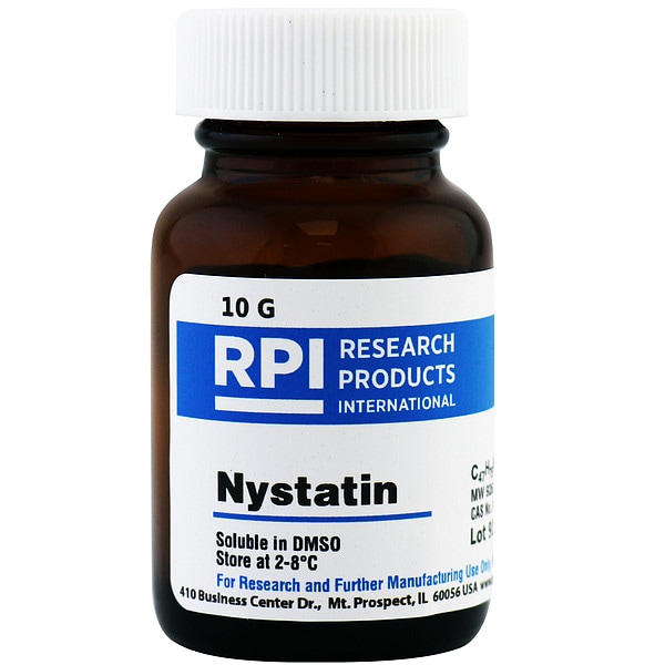Nystatin, CAS Number 1400-61-9, Molecular Weight 926.1, Chemical Formula C47H75NO17, Chemical Grade Lab, Shelf Life 18 mo, Special Information pH @25 Degrees C: 6.0 to 8.0