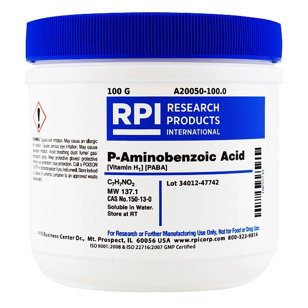 P-Aminobenzoic Acid (Vitamin H1), CAS Number 150-13-0, Purity Greater Than 95 Percent, Container Size 100 g, Form Powder, Molecular Weight 137.1, Solubility Water, Storage Temp. Room Temperature, Chemical Formula C7H7NO2, Shelf Life 18 mo