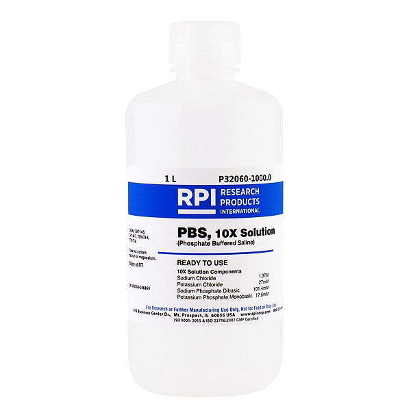 Phosphate Buffered Saline - 10X Sterile Solution, Concentration P32060, CAS Number 7447-40-7, 7558-79-4, 7647-14-5, 7732-18-5, 7778-77-0, Chemical Formula H2O; NaCl; KCl; Na2HPO4, Chemical Grade Lab, Chemical Container Size 1 L, Chemical Family Type Buffer, Shelf Life 18 mo, Special Information Sterile