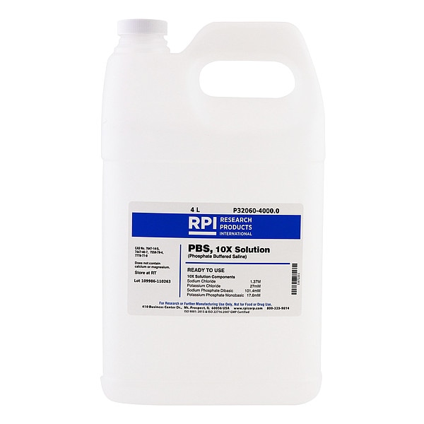 Phosphate Buffered Saline - 10X Solution, Concentration P32060, CAS Number 7447-40-7, 7558-79-4, 7647-14-5, 7732-18-5, 7778-77-0, Chemical Formula H2O; NaCl; KCl; Na2HPO4, Chemical Grade Lab, Chemical Container Size 4 L, Chemical Family Type Buffer, Shelf Life 18 mo, Special Information pH (10X Solution): 6.8 to 7.2