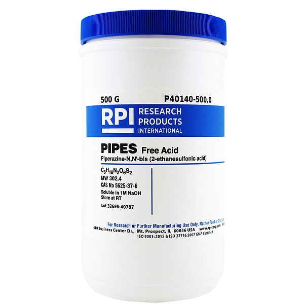 PIPES Free Acid, Concentration P40140, CAS Number 5625-37-6, Molecular Weight 302.4, Chemical Formula C8H18N2O6S2, Chemical Container Size 500 g, Chemical Family Type Buffers, Shelf Life 18 mo