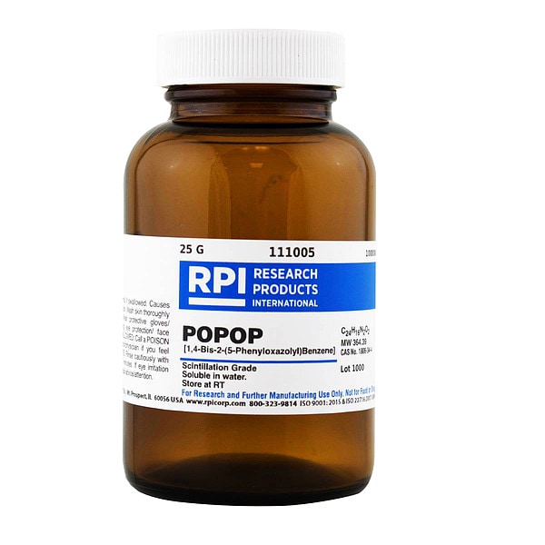 POPOP (1-4,bis-2-benzene), Concentration Scintillation, CAS Number 1806-34-4, Molecular Weight 364.39, Chemical Formula Scintillation, Calibration Certificate Scintillation, Shelf Life 18 mo