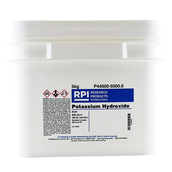 Potassium Hydroxide, CAS Number 1310-58-3, 7732-18-5, Molecular Weight 56.11, Chemical Formula KOH, Chemical Grade Lab, Chemical Family Type Reagent, Shelf Life 18 mo, Special Information BSE/TSE Free