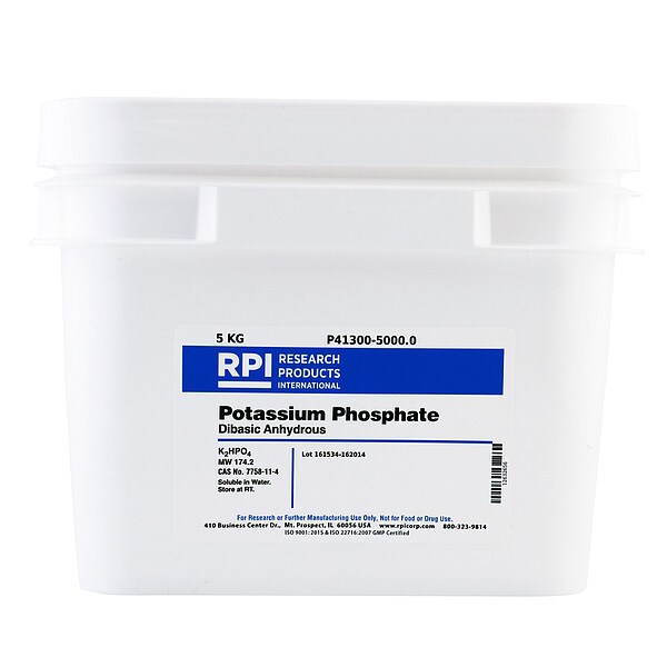 Potassium Phosphate - Dibasic - Anhydrous, Concentration P41300, CAS Number 7758-11-4, Molecular Weight 174.2, Chemical Formula K2HPO4, Chemical Grade Lab, Chemical Container Size 5 kg, Chemical Family Type Buffer, Shelf Life 18 mo, Special Information BSE/TSE Free
