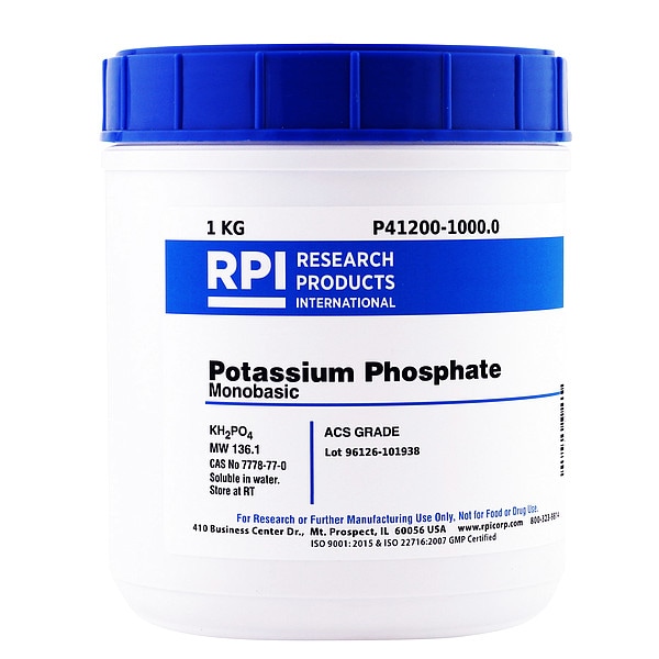 Potassium Phosphate - Monobasic, Concentration P41200, CAS Number 7778-77-0, Molecular Weight 136.1, Chemical Formula KH2PO4, Chemical Grade ACS, Chemical Container Size 1 kg, Chemical Family Type Buffer, Shelf Life 18 mo, Special Information BSE/TSE Free