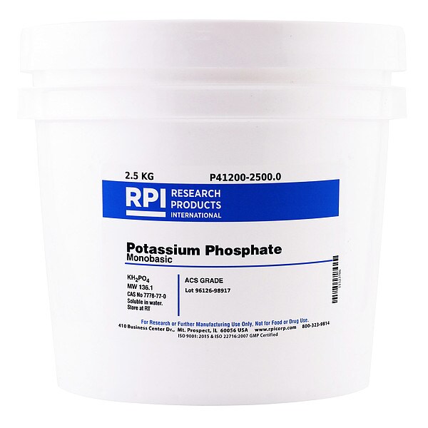 Potassium Phosphate - Monobasic, Concentration P41200, CAS Number 7778-77-0, Molecular Weight 136.1, Chemical Formula KH2PO4, Chemical Grade ACS, Chemical Container Size 2.5 kg, Chemical Family Type Buffer, Shelf Life 18 mo, Special Information BSE/TSE Free