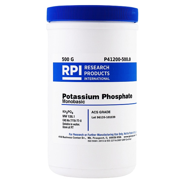Potassium Phosphate - Monobasic, Concentration P41200, CAS Number 7778-77-0, Molecular Weight 136.1, Chemical Formula KH2PO4, Chemical Grade ACS, Chemical Container Size 500 g, Chemical Family Type Buffer, Shelf Life 18 mo, Special Information BSE/TSE Free