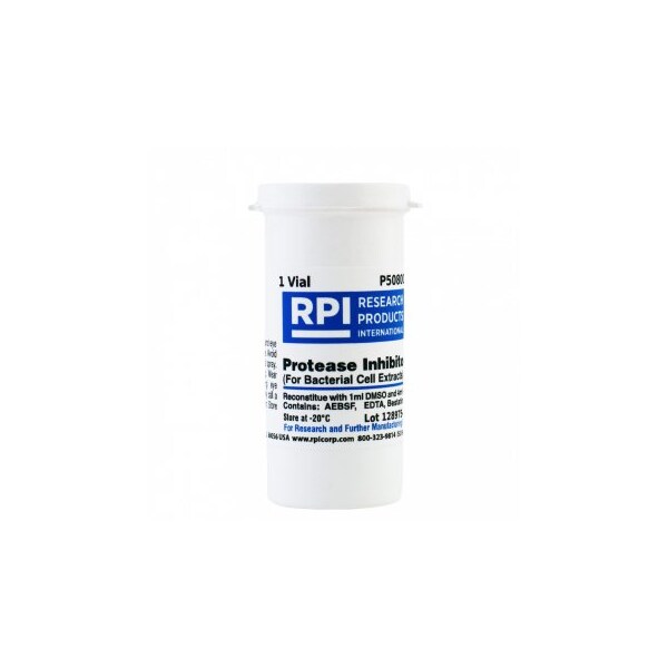 Lyophilized mixture of five protease inhibitors for use with bacterial cell extracts. Reconstitute with 1ml DMSO and 4ml water to obtain a 5ml solution. Will treat proteases extracted from 20g E.Coli.Store at -20°:CContains: AEBSF, EDTA, Bestatin, E-64, Pepstatin A
