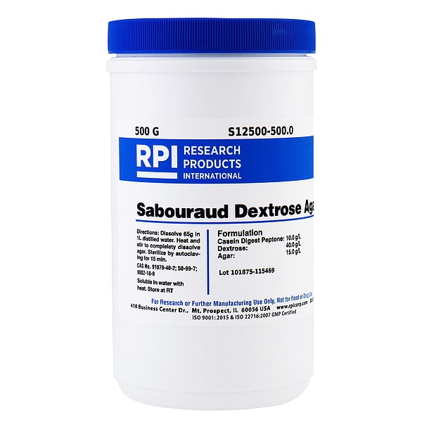 Sabouraud Dextrose Agar, Purity Greater Than 95 Percent, Container Size 500 g, Form Powder, Solubility Water, Storage Temp. Room Temperature, Shelf Life 18 mo
