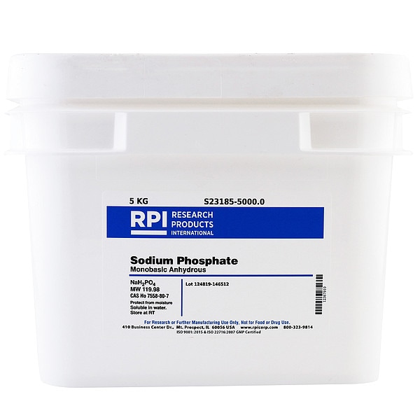 Sodium Phosphate - Monobasic Anhydrous, Concentration S23185, CAS Number 7558-80-7, Molecular Weight 119.98, Chemical Formula NaH2PO4, Chemical Grade USP, Chemical Container Size 5 kg, Chemical Family Type Buffer, Shelf Life 18 mo, Special Information BSE/TSE Free