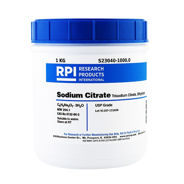 SodiumCitrate TrisodiumSalt Dihydrate, CAS Number 6132-04-3, Molecular Weight 294.1, Chemical Formula C6H5Na3O7 2H2O, Chemical Container Size 1 kg, Chemical Family Type Acids, Shelf Life 18 mo