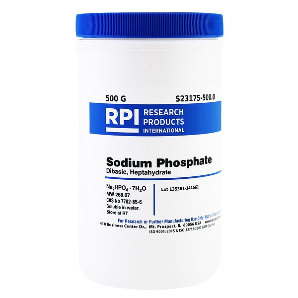 Sodium Phosphate - Dibasic Heptahydrate, Concentration S23175, CAS Number 7782-85-6, Molecular Weight 268.07, Chemical Formula Na2HPO4;7H2O, Chemical Grade USP, Chemical Container Size 500 g, Chemical Family Type Buffer, Shelf Life 18 mo, Special Information BSE/TSE Free