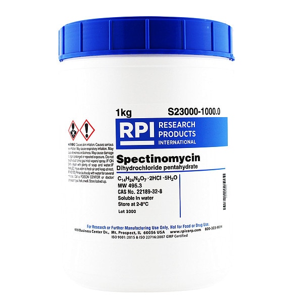 Spectinomycin, CAS Number 22189-32-8, Molecular Weight 495.3, Chemical Formula C55H96N16O13 2H2SO4, Shelf Life 18 mo