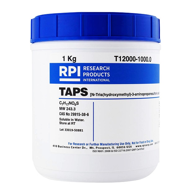 TAPS Free Acid, Concentration T12000, CAS Number 299115-38-6, Molecular Weight 243.3, Chemical Formula C7H17NO6S, Chemical Container Size 1 kg, Chemical Family Type Buffers, Shelf Life 18 mo