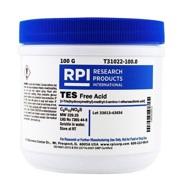 TES Free Acid, Concentration T31022, CAS Number 7365-44-8,, Molecular Weight 229.25, Chemical Formula C6H15NO6S, Chemical Container Size 100 g, Chemical Family Type Buffers, Shelf Life 18 mo
