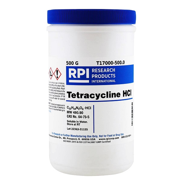 Tetracycline Hydrochloride, CAS Number 64-75-5, Molecular Weight 480.9, Chemical Formula C22H24N2O8 HCl, Shelf Life 18 mo