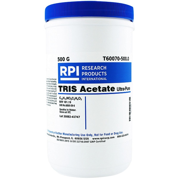 TRIS Acetate Ultra Pure, Concentration T60070, CAS Number 6850-28-8, Molecular Weight 181.2, Chemical Formula C14H11NO3C2H4O2, Chemical Container Size 500 g, Chemical Family Type Buffers, Shelf Life 18 mo