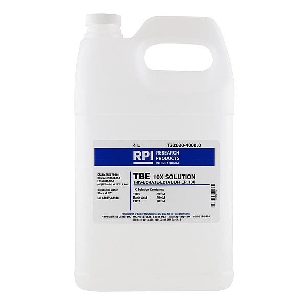 TRIS-Borate-EDTA - 10X Solution, Concentration T32020, CAS Number 10043-35-3, 6381-92-6, 77-86-1, 7732-18-5, Chemical Formula C4H11NO3; H3BO3; C10H14N2Na2O8;2H2O; H2O, Chemical Grade Lab, Chemical Container Size 4 L, Chemical Family Type Solution, Shelf Life 18 mo, Special Information pH (1X Solution): 8.15 to 8.45