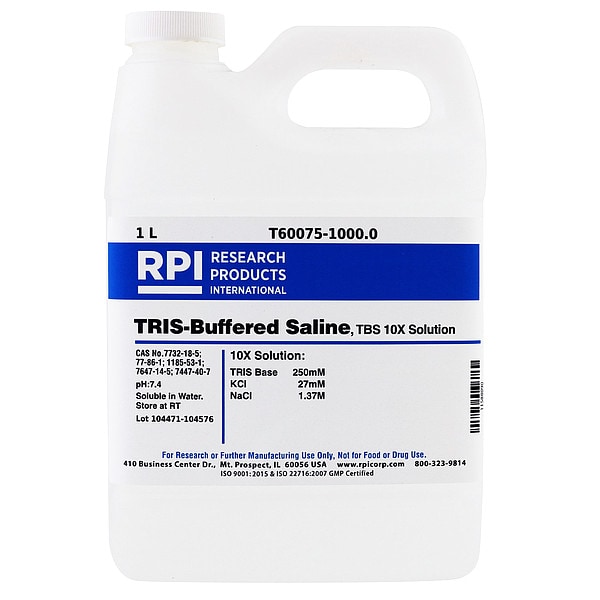 TRIS Buffered Saline - 10X Solution, Concentration T60075, CAS Number 1185-53-1, 7447-40-7, 7647-14-5, 77-86-1, 7732-18-5, Chemical Formula C4H11NO3; C4H11NO3;HCl; KCl; NaCl; H2O, Chemical Grade Lab, Chemical Container Size 1 L, Chemical Family Type Buffer, Shelf Life 18 mo, Special Information BSE/TSE Free